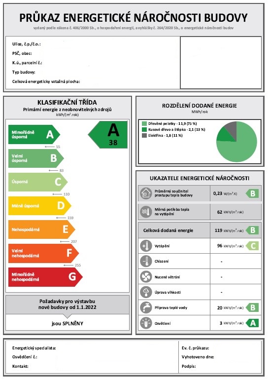 Průkaz energetické náročnosti budovy (PENB) slouží pro jednoduché hodnocení budovy z hlediska její energetické náročnosti, tj. hodnocení kvality objektu z hlediska tepelných ztrát, výše spotřebovávaných VŠECH energií a s tím spojených nákladů na provoz budovy. Dle výše spotřeby energií (v kWh spotřebované energie na m2 užitkové plochy za rok) je budova zařazena do1 z 7 tříd (A-G): A-C jsou třídy vyhovující, D-G třídy nevyhovující. Uvedené třídy jsou obdobou tříd spotřeby energií elektrospotřebičů na jaké jsme zvyklí u ledniček, praček a jiných elektrospotřebičů.U budov jsou však hodnoceny spotřeby všech vstupujících energií, tj. energie na vytápění, chlazení, větrání, úpravu vlhkosti vzduchu, přípravu teplé vody a osvětlení.